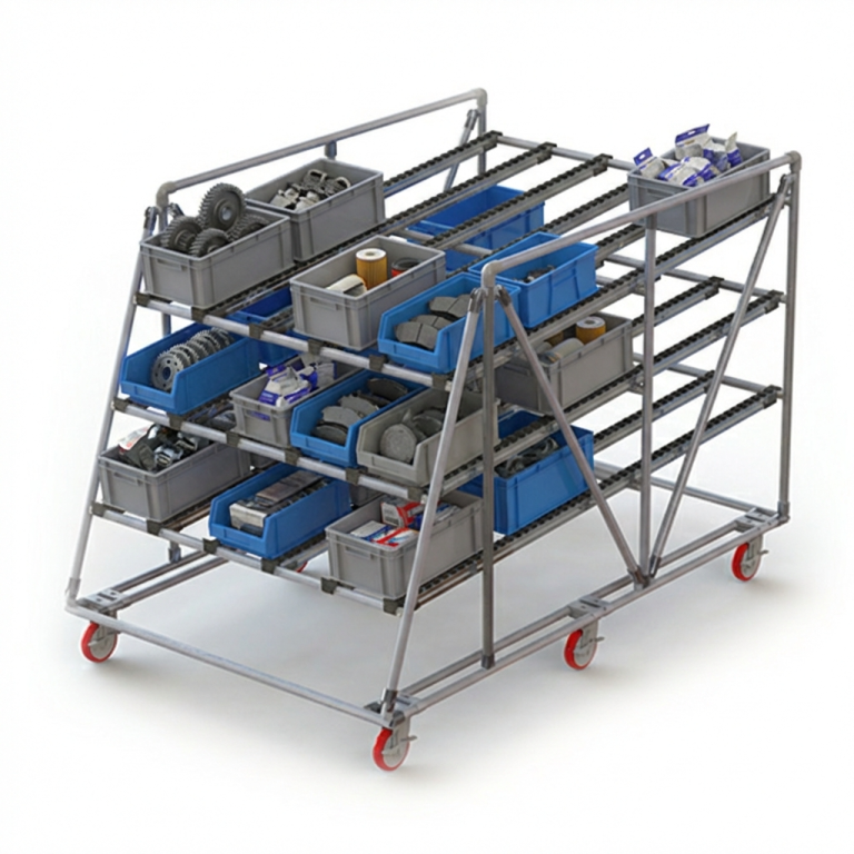 Configurable line side storage and marketplace racks for optimal material presentation and operator access.